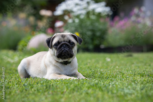 © Ilya, Obraz premium Cute pug puppy wearing a flea and tick collar lying on a fresh green lawn