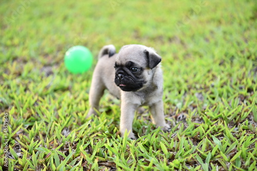 © jarun011, Fototapeta premium Cute puppy brown Pug playing with ball in green lawn