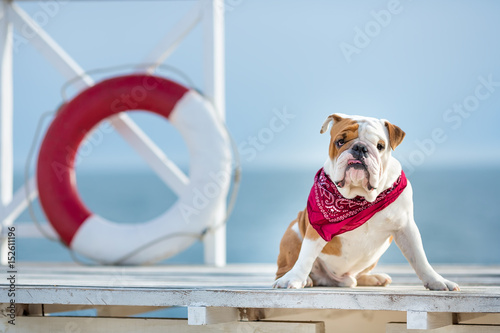 Naklejka premium Cute puppy of english bull dog with funny face and red bandana on neck close to life saving bouy round floater