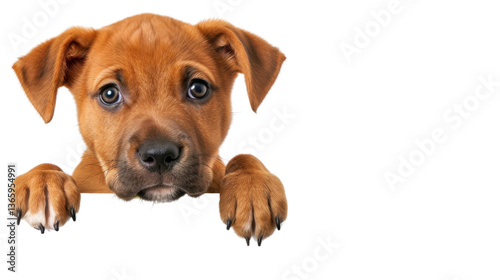 © Tusike, Obraz premium Cute puppy peeking over a blank sign with transparent background