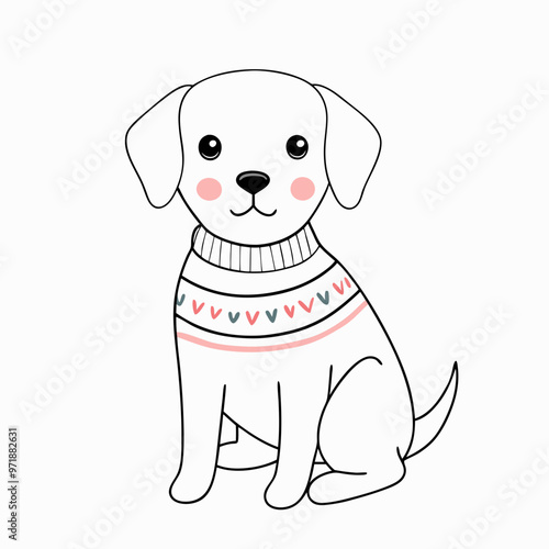 © AngelinArt, Fototapeta premium Cute puppy wearing a sweater with heart patterns and smiling on a white background