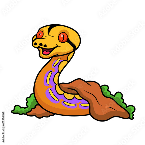 Fototapeta premium Cute purple albino tiger reticulated python cartoon out from hole
