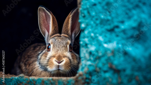 © Bulat, Fototapeta premium Cute rabbit peeking out from behind turquoise colored wall. Copy space. Generative AI