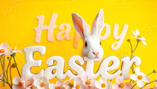 Obraz premium cute rabbit peeking out from text Happy Easter on a yellow background, Easter...
