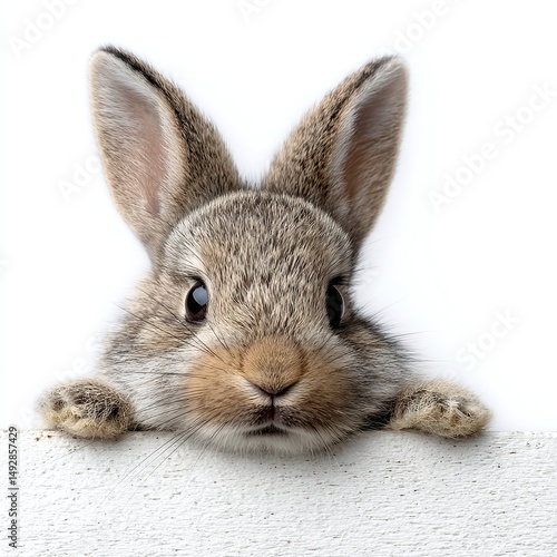 © Banstanks, Obraz premium Cute rabbit peeking over a white surface, showcasing its curious expression against a plain background (1)