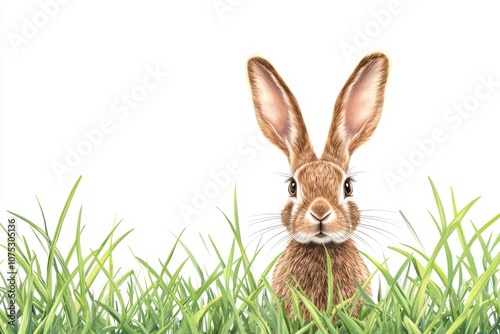 Fototapeta premium Cute rabbit peeking through green grass, white isolated background.