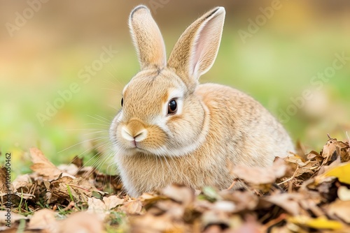 Fototapeta premium Cute rabbit sitting amid autumn leaves, soft fur, warm colors, nature...