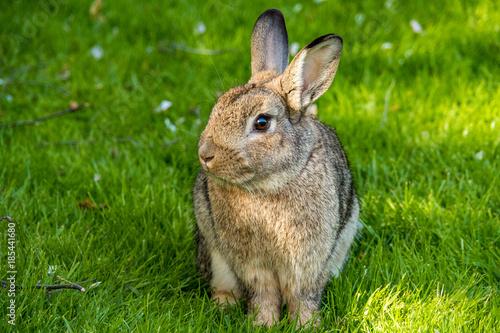 Fototapeta premium cute rabbit sitting on green grass looking left