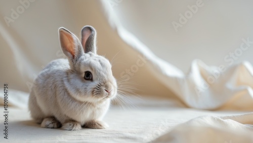 © Den Boro Day, Obraz premium Cute rabbit sitting quietly on a light background.
