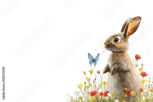 Fototapeta premium Cute rabbit standing amidst colorful flowers and a butterfly in a serene natural setting