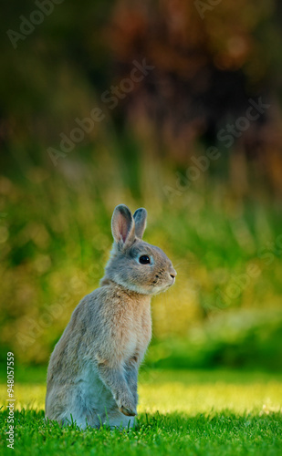 Fototapeta premium Cute rabbit standing on its hind legs on a lush green meadow, surrounded by nature.