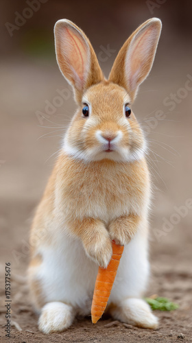 © Sergey, Fototapeta premium Cute rabbit standing upright holding carrot in paws on earthy background