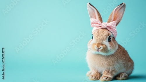 Fototapeta premium Cute rabbit wearing a pink bow on a pastel background, perfect for spring themes.