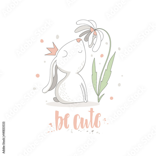 © rosypatterns, Fototapeta premium Cute rabbit with flower and inscription