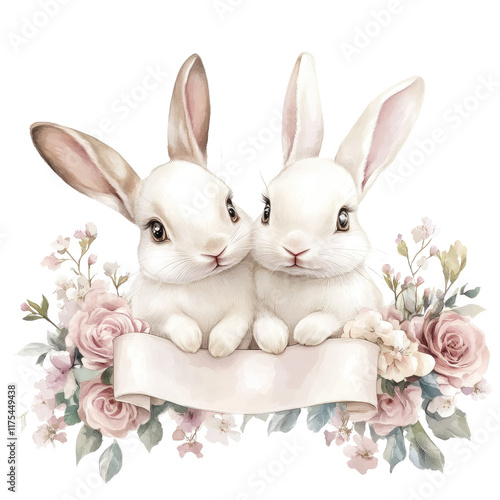 Obraz premium Cute Rabbits with Floral Decoration and Blank Banner for Design