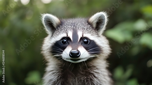Fototapeta premium Cute Raccoon Face with Expressive Eyes Surrounded by Greenery