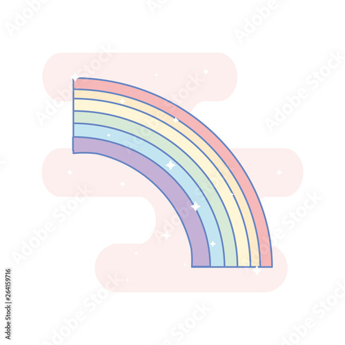 Fototapeta premium Cute rainbow. Sticker, patch, badge, pin or tattoo template. Pink blob and sparkling stars in the background. Linear style illustration. Vector.