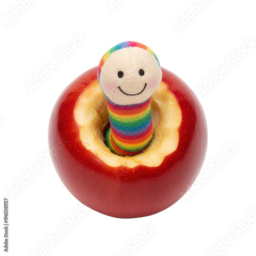 © Vinh, Obraz premium Cute Rainbow Worm Emerging From a Red Apple