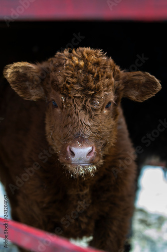 © Beatrice, Fototapeta premium Cute Red Angus Calf with Curly Hair Outside in Winter