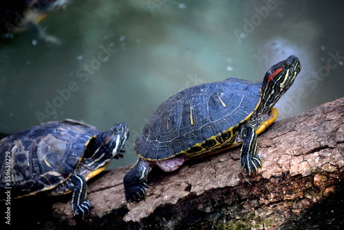 © aliirsha, Fototapeta premium Cute red eared slider turtle on the wood