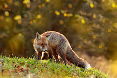 Naklejka premium Cute Red Fox, Vulpes vulpes in fall forest. Beautiful animal in the nature habitat. Wildlife scene from the wild nature. Fox running in orange and yellow autumn leaves. Animal in fall wood habitat.