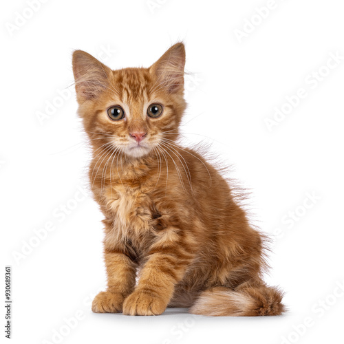 © Nynke, Obraz premium Cute red house cat kitten, sitting up side ways. Looking beside camera. isolated on a white background.