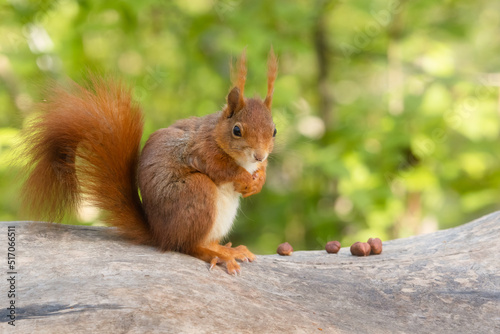 Fototapeta premium Cute red squirrel sitting on a tree trunk in the spring forest
