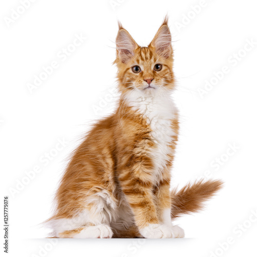 © Nynke, Fototapeta premium Cute red with white Maine Coon cat kitten, sitting up side ways. Looking curious to camera. isolated on a white backgroound.