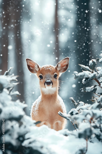 Fototapeta premium Cute reindeer in a Christmas snowy forest, surrounded by falling snow, creating a magical winter scene.Vertical winter card for New Year greetings on social networks