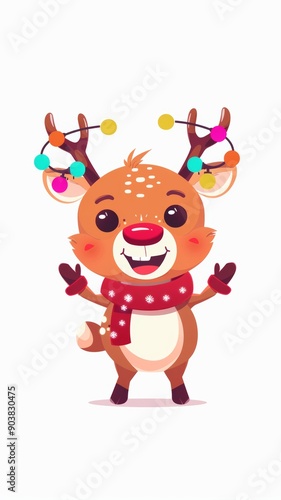 Naklejka premium Cute Reindeer with christmas festive lights antlers, a simple flat vector...