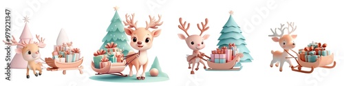 Naklejka premium Cute reindeers with sleighs full of gifts celebrate the holiday season amidst Christmas trees and festive joy.