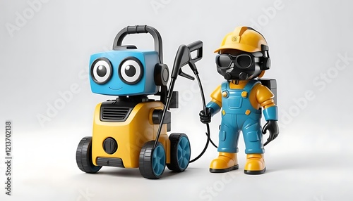 Fototapeta premium Cute Robot and Worker Cleaning with Pressure Washer
