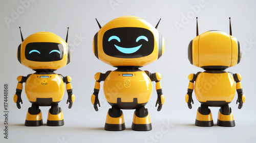 © Sahraya, Fototapeta premium Cute robot character with smile face. 3d realistic vector set of cartoon funny ai chatbot mascot in different poses. Artificial intelligence electronic agent. Friendly digital support assistant.