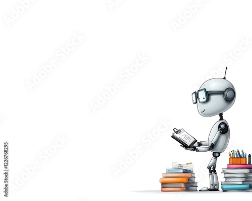 © CHA, Naklejka premium Cute Robot Reading Among Stacked Books and Notebooks