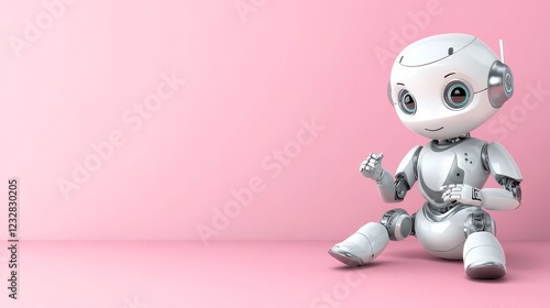 Fototapeta premium Cute robot sits on pink background technology future - A charming robot displays joy and playfulness in a minimalist environment symbolizing innovation creativity technology and fun