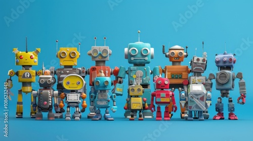 © Mas, Fototapeta premium Cute robot using 3D modeling software on blue background, AI generated image
