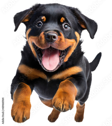 Fototapeta premium Cute rottweiler puppy jumping. Playful dog cut out at background.