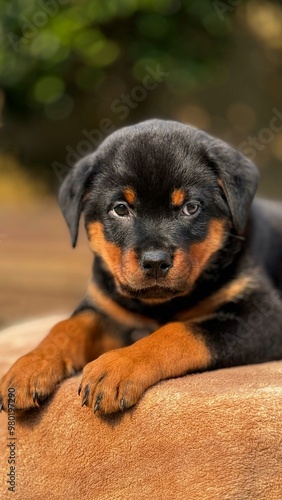 © Marli, Fototapeta premium Cute rottweiler puppy lying down resting outdoors.