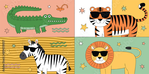 © Popular design, Fototapeta premium Cute Safari Animals on Summer Vacation Beach Relaxing Cartoon Vector Set