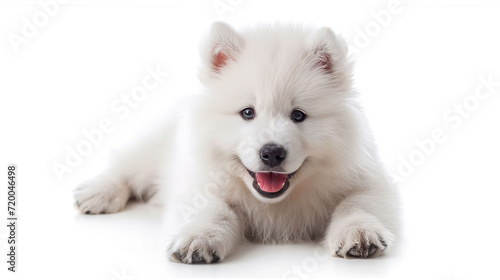 Obraz premium Cute samoyed puppy lying on a white background.