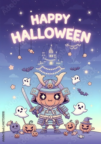 Fototapeta premium Cute Samurai Character for Halloween Celebration with Ghosts and Pumpkins