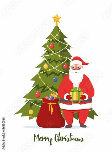 Fototapeta premium Cute Santa Claus character with gift in his hands and decorated christmas tree behind him. Santa smiling and show gift box. Merry Christmas and Happy New Year card, banner. Vector illustration.