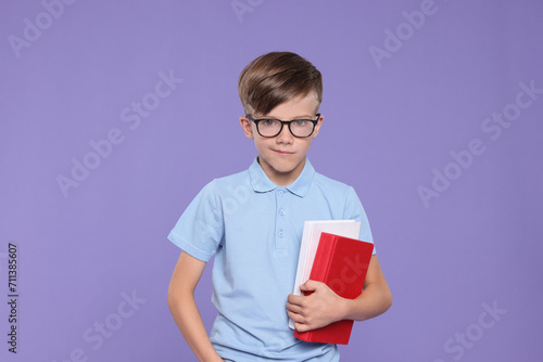 Fototapeta premium Cute schoolboy in glasses holding books on violet background