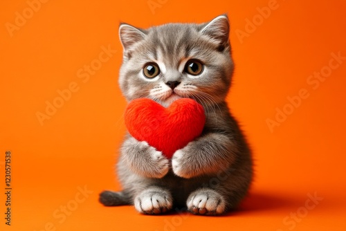 © A, Obraz premium Cute scottish fold young cat with fluffy red heart - sign of love, funny greeting card. Digital ads concept art. Scottish fold - my treasured cat. February 14 heart animal. Love pet theme.