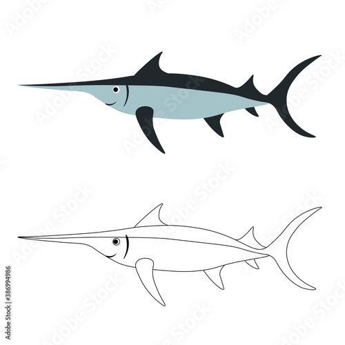 Naklejka premium Cute sea fish sword isolated on white background. Marine animals in outline and flat style. Cartoon wildlife for web pages. Stock vector illustration for decor and design, textiles, books, magazines