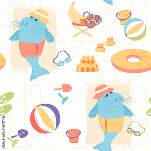 Naklejka premium Cute seal resting on the beach. Vector hand drawn illustration in simple hand drawn modern style. Adorable seamless pattern.