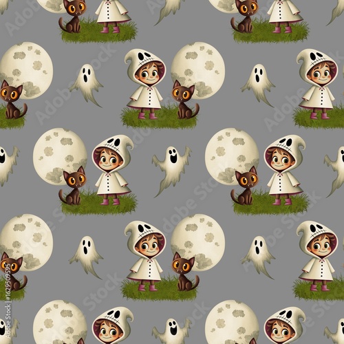 © Людмила Литвин, Naklejka premium Cute seamless pattern, a child in a ghost costume and pink boots, and a black cat with orange eyes against the background of a full moon.