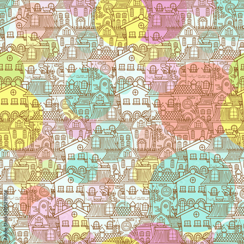 © Drekhann, Obraz premium Cute seamless pattern of doodle houses.