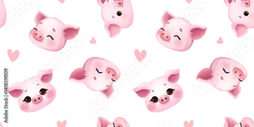 © Daryna Digital Art, Fototapeta premium Cute seamless pattern with a funny pink pig face on a white background with hearts