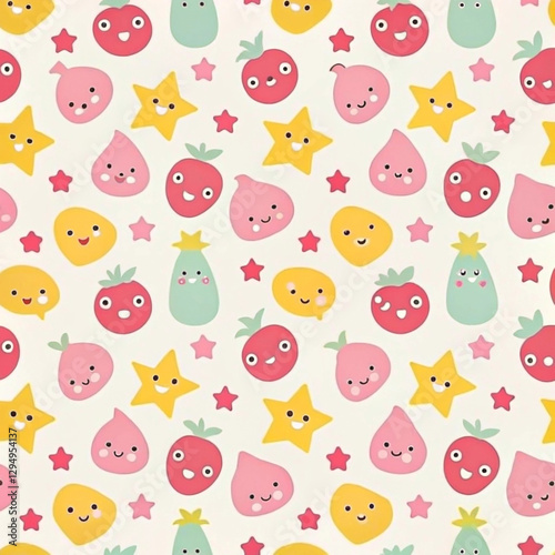 © setan cell, Obraz premium Cute seamless pattern with cartoon fruits and stars.
